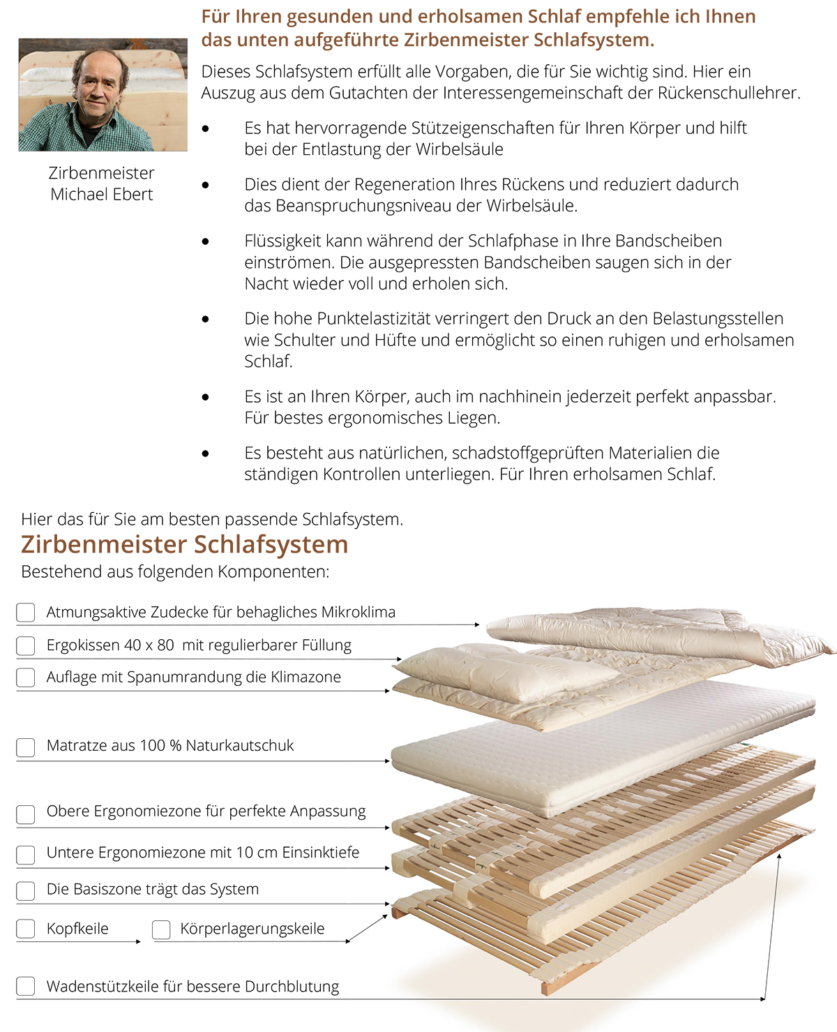 Um für unsere Kunden den bestmöglichen Schlafplatz auszustatten beschäftigten wir uns die letzten Jahre mit verschiedensten Naturschlafsystemen. Denn ein gesunder Schlaf ist eines der elementarsten Bedürfnisse des Menschen. Nur, wer sich Nachts erholt, kann tagsüber beschwingt und kraftvoll den Tag genießen. Den bestmöglichen Schlaf erreichten wir mit einem auf den Körper einstellbaren Schlafsystem. Mit dem ZirbenMeister Schlafsystem V5. Es erfüllt höchste Ansprüche für Schulterbereich, Wirbelsäule, Bandscheiben, Nacken, Lendenwirbel und Beckenbereich.