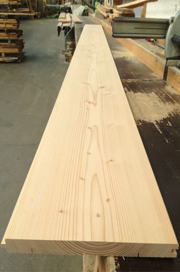 Eine Besonderheit an Massivholzdielen (Schloßdielen). 85 m² feinjährige Douglasie als Mondphasenholz 2007 geerntet. Sie wuchs auf mageren Muschelkalkböden bei Bad Rodach. Aus ihr fertigten wir diesen einzigartigen Boden.