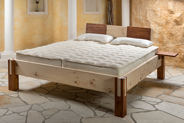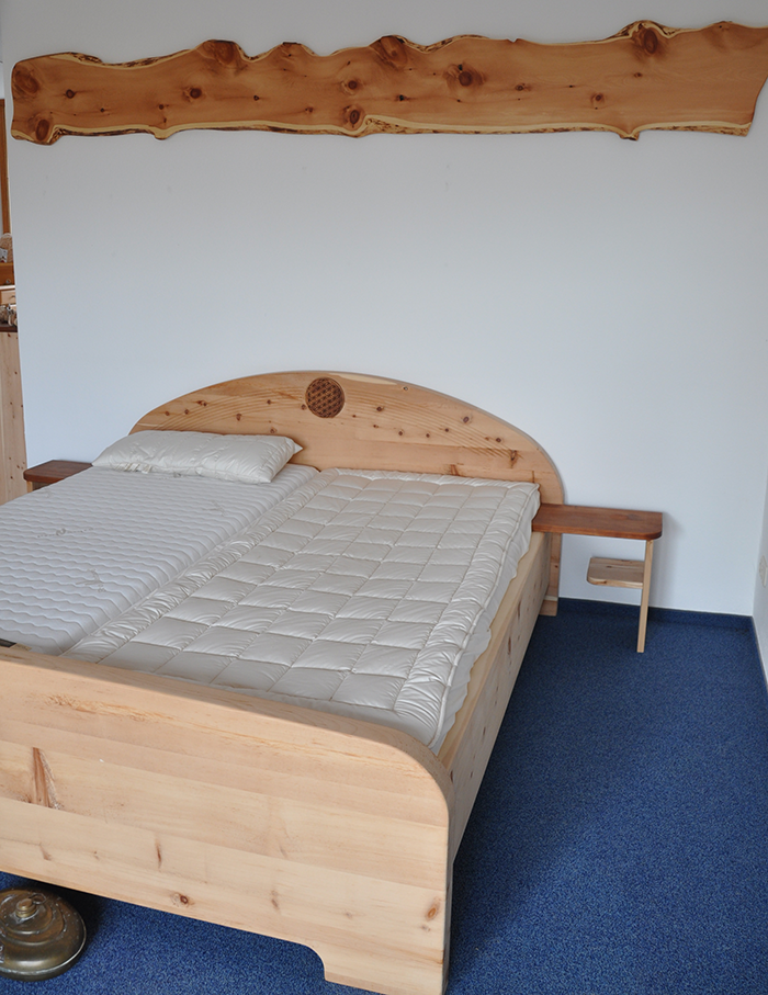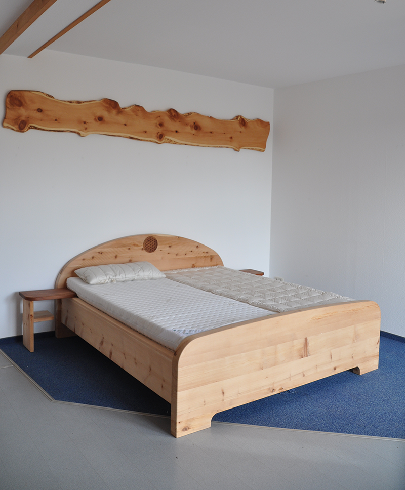 Metallfreies Zirbenholzbett aus eigener Herstellung.